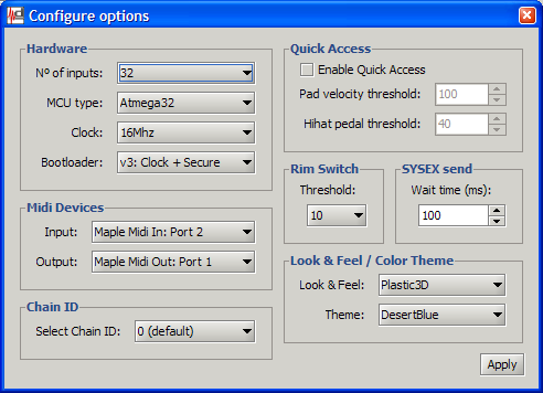 6. Run MCT. Go to Options->Configure... and select 'Maple Midi In: Port 2' as Input an 'Maple Midi Out: Port 1' as Output and click Apply.